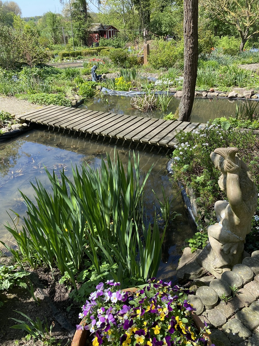 Wir leben mit einem großen Garten mit Blumen, Rosen, Gemüse, Sträuchern, Bäumen und Teichen. Ein Gemüsegarten, mit Kompost bewirtschaftet und ein kleines Gewächshaus sorgen weitgehend für unsere Ernährung.
